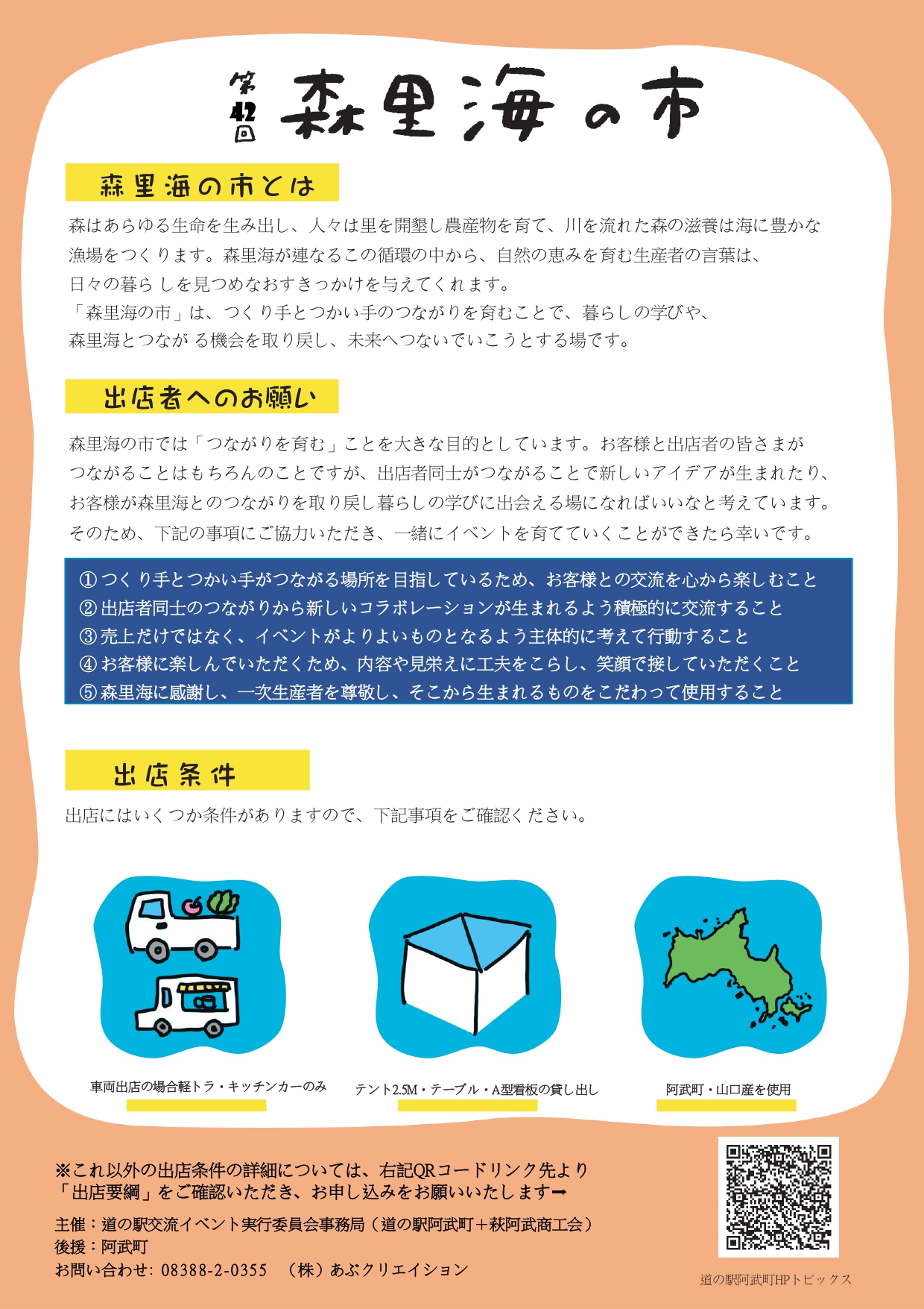 - 阿武町産・北浦産・山口県産の農林水産物の販売、農林水産物を使った加工品の販売、 キッチンカーでのフードやお菓子などの飲食物の販売提供、手芸品、工芸品その他体験・ ワークショップなど。(いずれも事務局による内容審査を行う。)